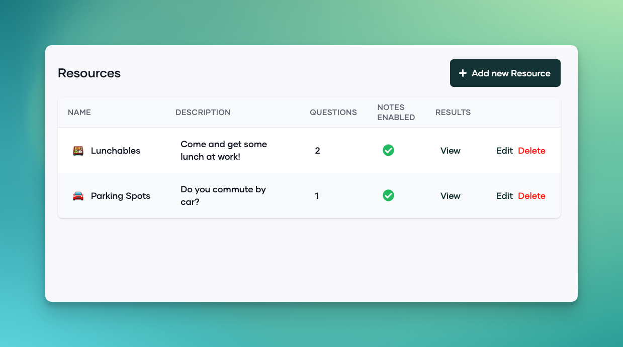 The Resources section of our app is designed to provide users with a central location to access and manage different resources within their organization. This could include anything from available lunch options, parking spots to office supplies.