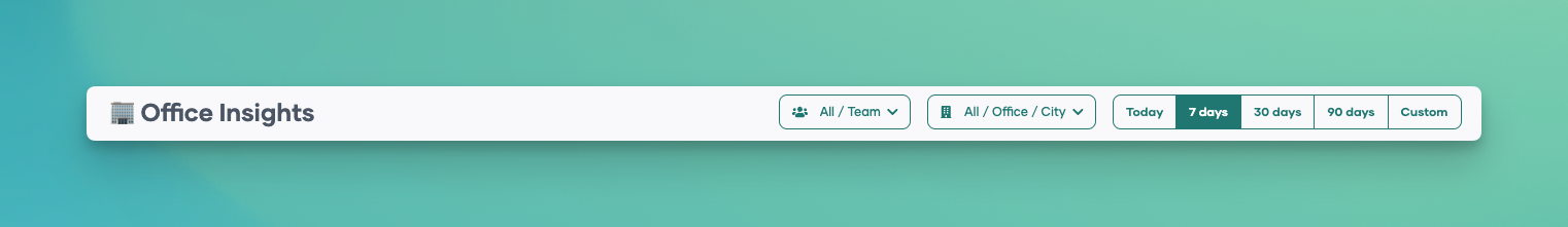 Office Insights features a user-friendly interface with three primary filters: Employee/Team, Office/Location, and Time Selection. These filters allow you to tailor the dashboard view to your specific needs, enabling you to analyze data for all employees, teams, or entire office locations over selected time periods.: