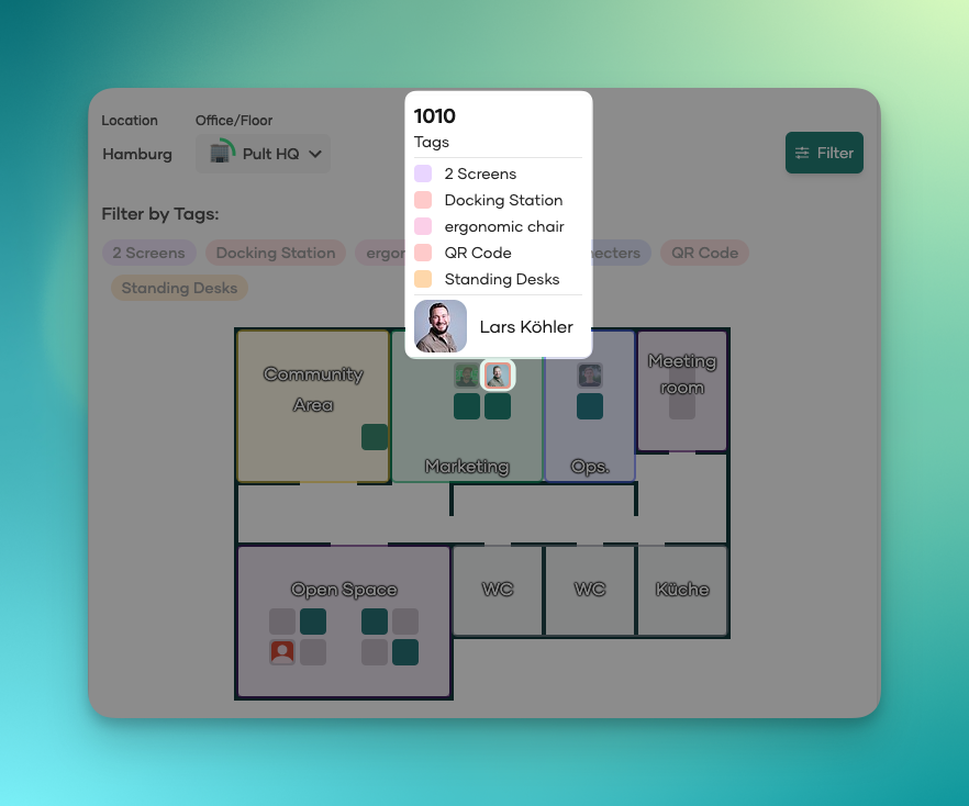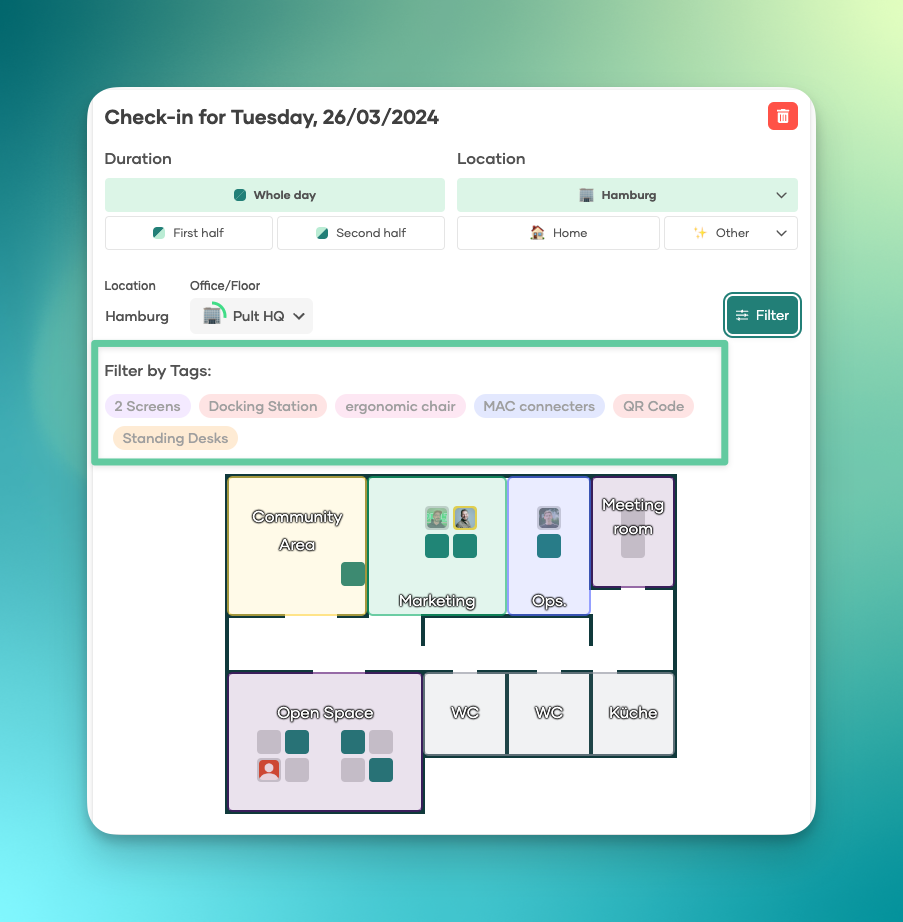 Choose a free workplace. To find the ideal place, you can filter the equipment with our Tags. Simply click on Filter to expand the Filter by Tags view: