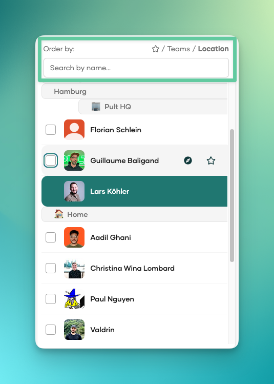 On the right side you can see who will be working where. Here you can filter by teams, location and favorites.