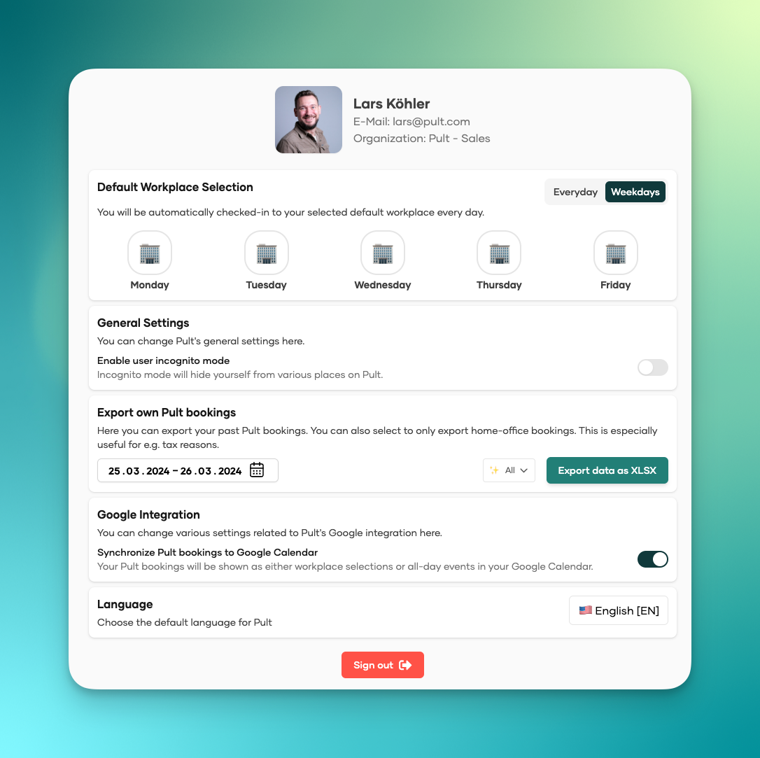 In your personal settings you can set your preferences for privacy, language and export your own Pult bookings as an xlsx file.