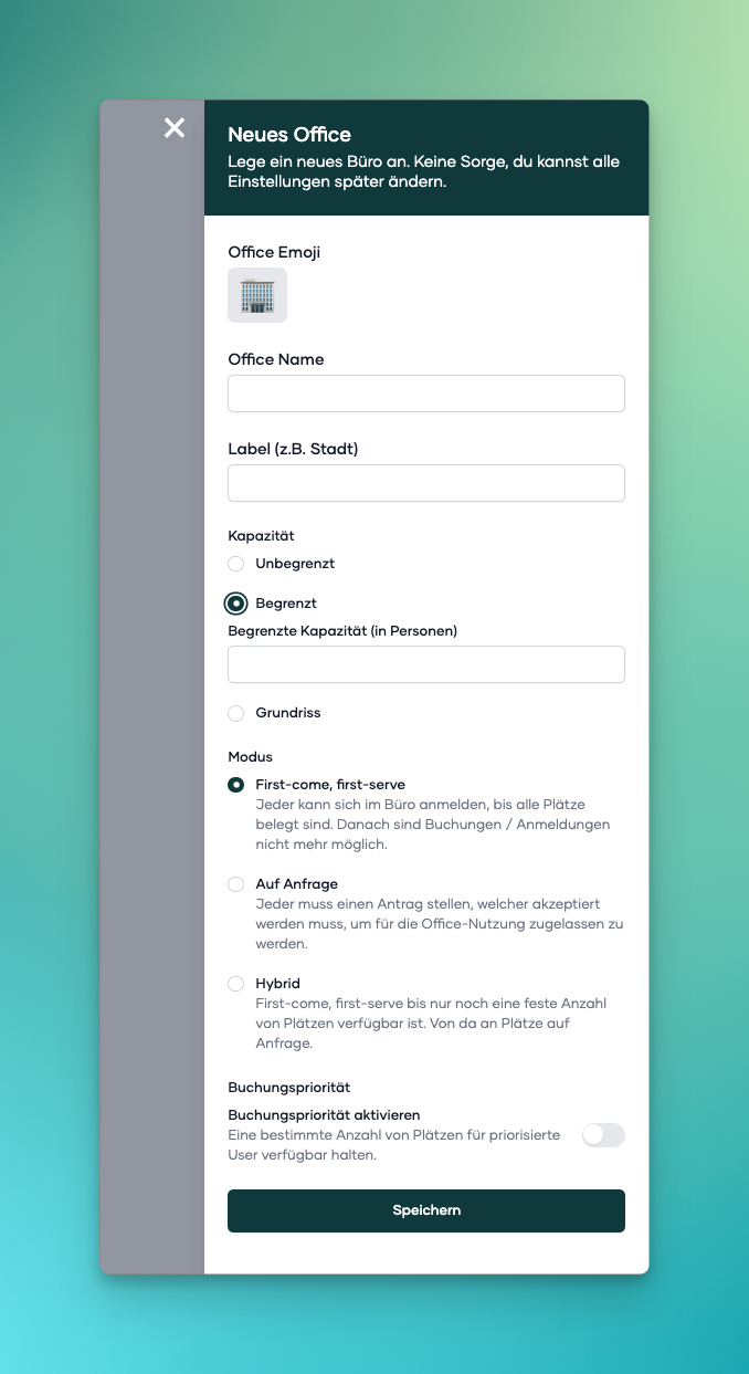 Wählen Sie zwischen 'Unbegrenzt' oder 'Begrenzt'. Wenn Sie 'Unbegrenzt' auswählen, können unbegrenzt Benutzer ins Büro einchecken. Mit 'Begrenzt' müssen Sie die maximale Anzahl von Personen angeben, die das Büro belegen können. Beide Optionen funktionieren ohne einen Grundriss.