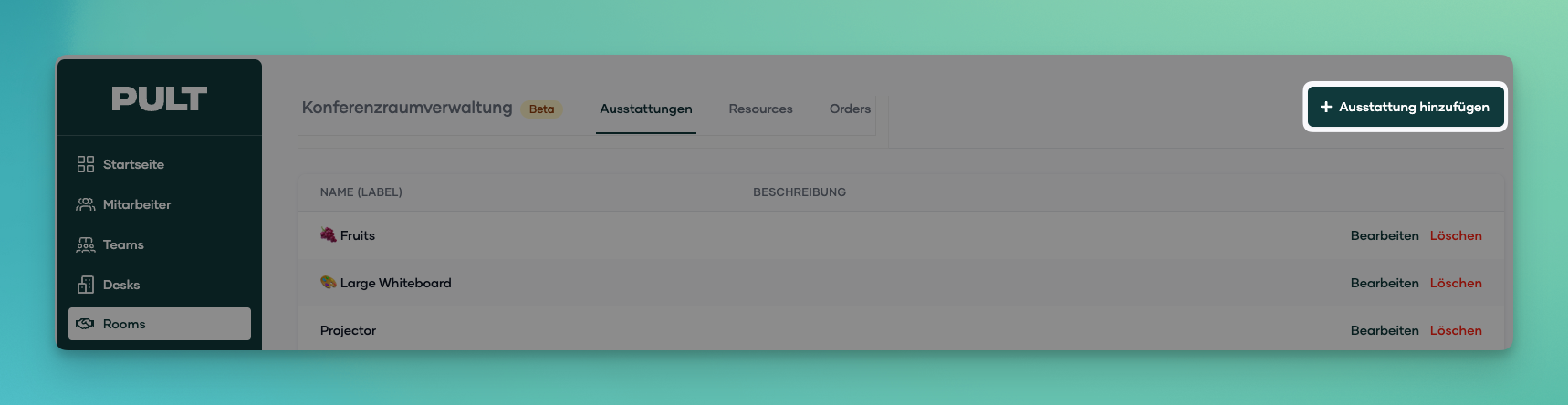 Im nächsten Artikel erfahren Sie, wie Sie die von Ihnen erstellten Ausstattungen zu Besprechungsräumen hinzufügen können.