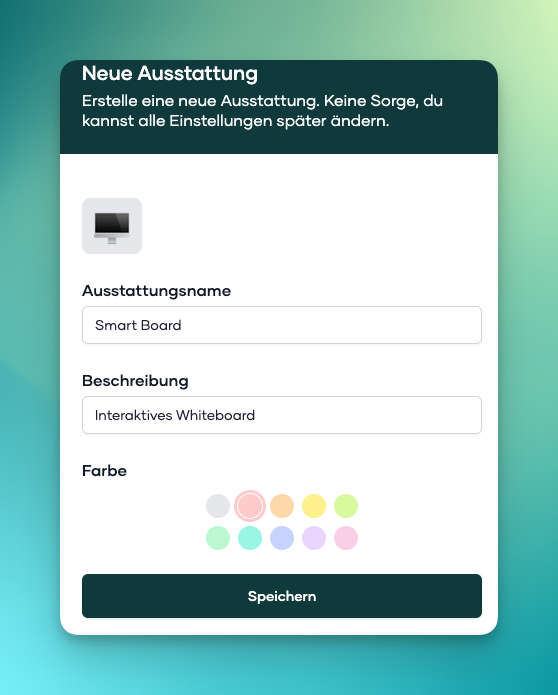 Wählen Sie im Feld Farbe eine Farbe für die Ausstattung aus. Diese Farbe wird verwendet, um die Tags der Annehmlichkeiten farblich zu unterscheiden.