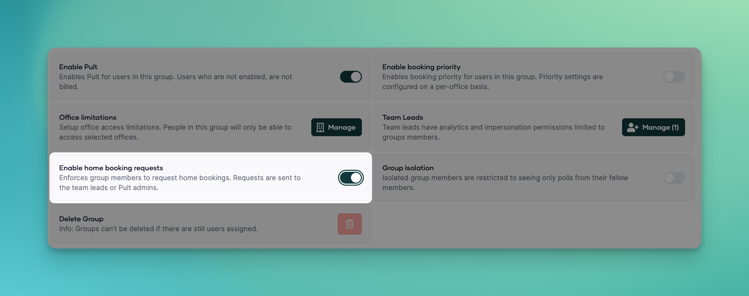 You can set up home booking requests directly in Pult if your corporate policies require approval of home office days. The requests can be accepted by team leads or admins.